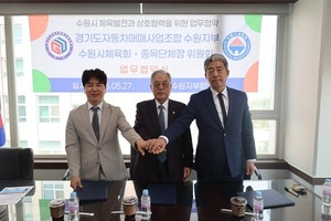 [수원 = 경인방송] 경기도자동차매매사업조합 수원지부가 수원시체육회·수원시체육회종목단체장위원회와 학생 선수 후원을 위한 업무협약을 체결했다고 오늘(27일) 밝혔습니다.업무협약엔 김남윤 조합 지부장, 박광국 시체육회장과 곽도용 시 문화체육청년국장, 곽영붕 시체육회종목단체위원장, 한희섭 시육상연맹회장 등이 참석했습니다.세 단체는 이번 협약을 통해 지역 체육 인재 육성과 생활체육 저변확대를 위한 실질적인 지원 방안을 마련하기로 뜻을 모았습니다.아울러 학생 선수들이 안정적으로 훈련받고 대회에 참가할 수 있도록 후원금을 지원할 계획입니다.곽